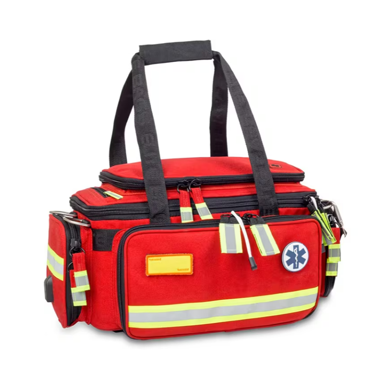 Fabricada en materiales resistentes al desgaste, esta bolsa soporta traslados y condiciones de uso exigentes. Además, las asas y correas ajustables ofrecen comodidad durante el transporte, mientras que su acabado en color rojo y zonas reflectantes mejoran la visibilidad en escenarios de emergencias. Con esta bolsa, los profesionales de la salud y socorristas pueden realizar su labor de forma más eficaz, teniendo a mano todo el material indispensable en soporte vital básico.