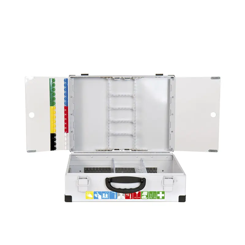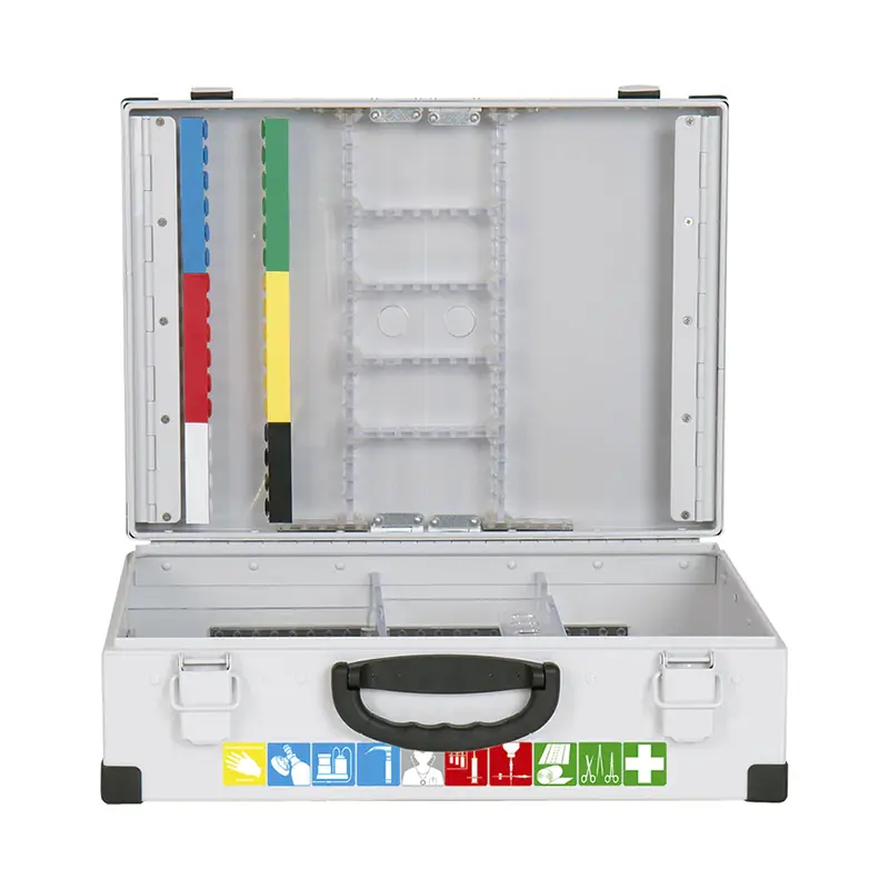 Las dimensiones del Botiquín metálico primeros auxilios EUROMED son aproximadamente 525 × 390 × 180 mm. Está fabricado en aluminio resistente con un grosor de 1,5 mm y presenta un color gris claro brillante. Los bordes del estuche están soldados con aluminio y hay refuerzos adicionales en forma de protectores de esquina. Las bisagras son continuas y están hechas de varillas. Los cierres de palanca son bloqueables y están equipados con sellos de seguridad. El Botiquín metálico primeros auxilios EUROMED incluye paneles transparentes que mejoran la visibilidad. Cuenta con un sistema variable de organización y división llamado Rastflex. Además, se incluye una barra de ampollas Varioflex que proporciona espacio para 32 medicamentos de emergencia de hasta 20 ml.