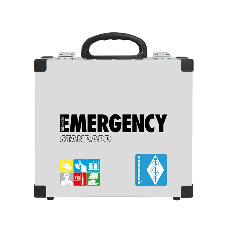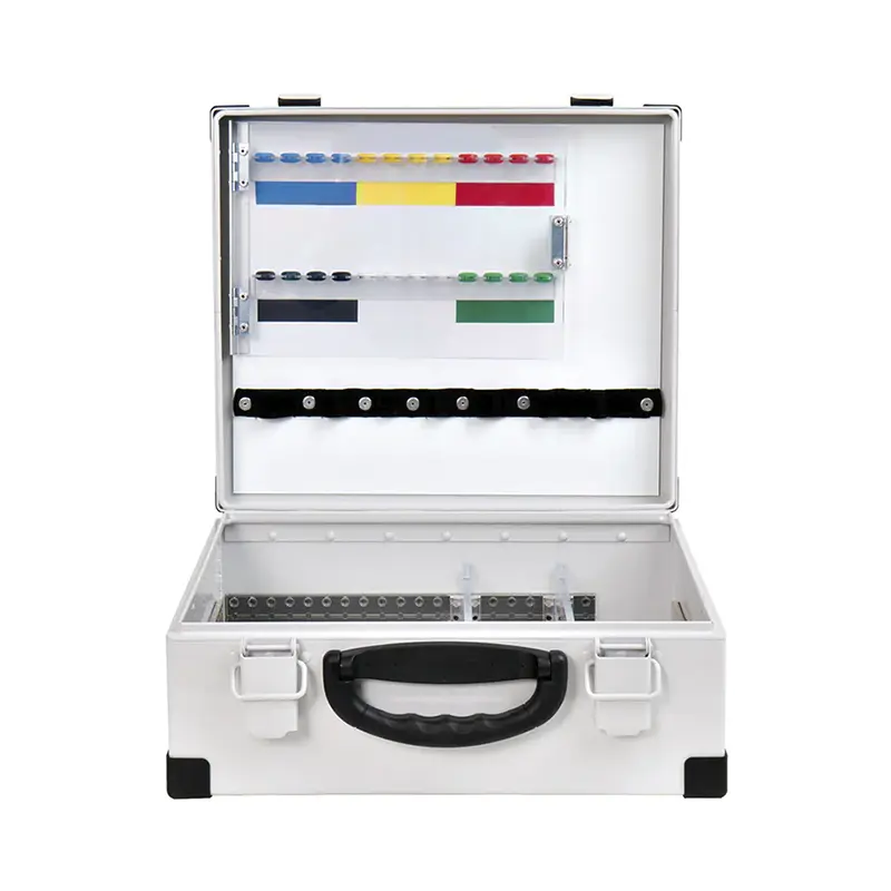 Las dimensiones del Botiquín metálico primeros auxilios STANDARD son aproximadamente 405 × 360 × 160 mm. Está fabricado en aluminio resistente con un grosor de 1,5 mm y presenta un color gris claro brillante. Los bordes del estuche están soldados con aluminio y hay refuerzos adicionales en forma de protectores de esquina. Las bisagras son continuas y están hechas de varillas. Los cierres de palanca son bloqueables y están equipados con sellos de seguridad. El Botiquín metálico primeros auxilios STANDARD incluye paneles transparentes que mejoran la visibilidad. Cuenta con un sistema variable de organización y división llamado Rastflex. Además, se incluye una barra de ampollas Varioflex que proporciona espacio para 24 medicamentos de emergencia de hasta 20 ml.