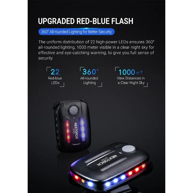 La UT22 de NEXTORCH ofrece un modo dual de funcionamiento, con destello (STROBO) en rojo-azul y luz blanca, ideal para su uso como luz de emergencia, linterna de pecho, montaje en casco táctico o en cualquier panel MOLLE.