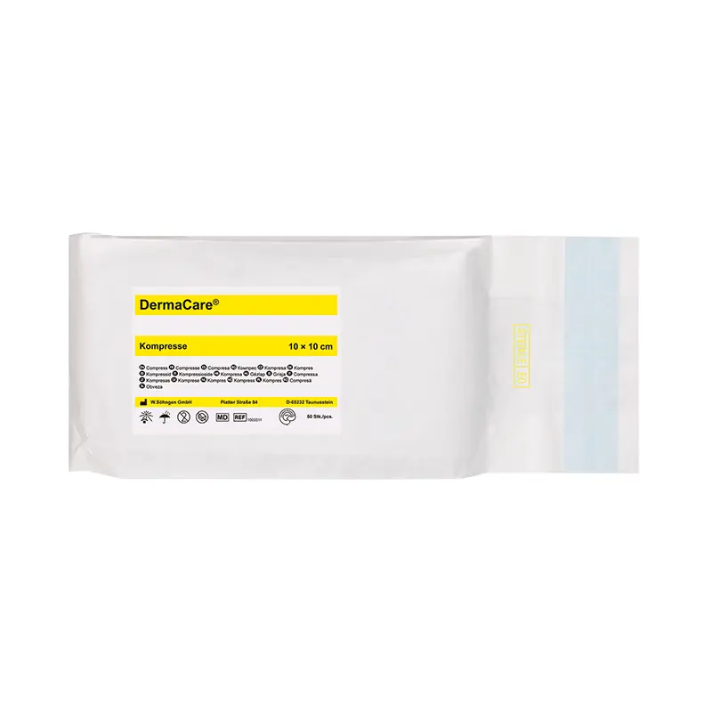 DermaCare® – el cuidado suave de heridas. Tejido de viscosa, especialmente suave y flexible, con una capacidad de absorción extremadamente alta de 2.000 g/m². Con una capa antiadherente de PP hidrófilo en ambos lados, superficie absolutamente lisa, que no se adhiere a la herida. Amable con la piel, transpirable, amigable para el paciente, sin causar irritaciones ni reacciones alérgicas excesivas. Fisiológicamente seguro, sin agentes químicos ni blanqueadores ópticos. Esterilizado con óxido de etileno, en paquete tipo ‘peel’, código de color amarillo.