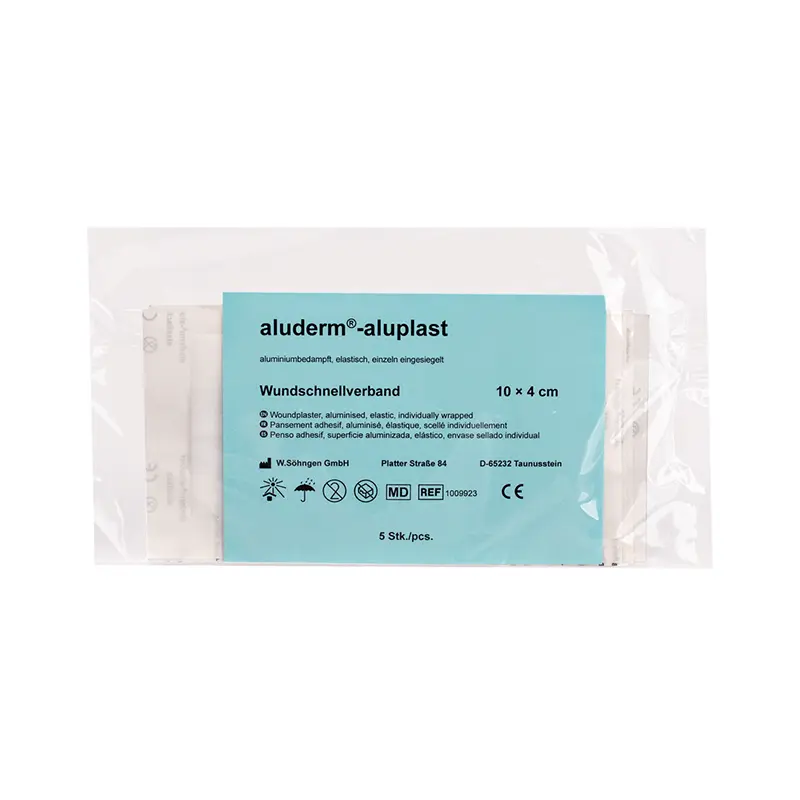 El apósito con aluderm®. aluderm®-aluplast es un apósito especial con una almohadilla aluderm® recubierta de aluminio y una capa absorbente. aluderm® no se adhiere a la herida, no genera fibras, tiene una alta capacidad de absorción, puede ayudar en la formación y curación de la piel y es transpirable.